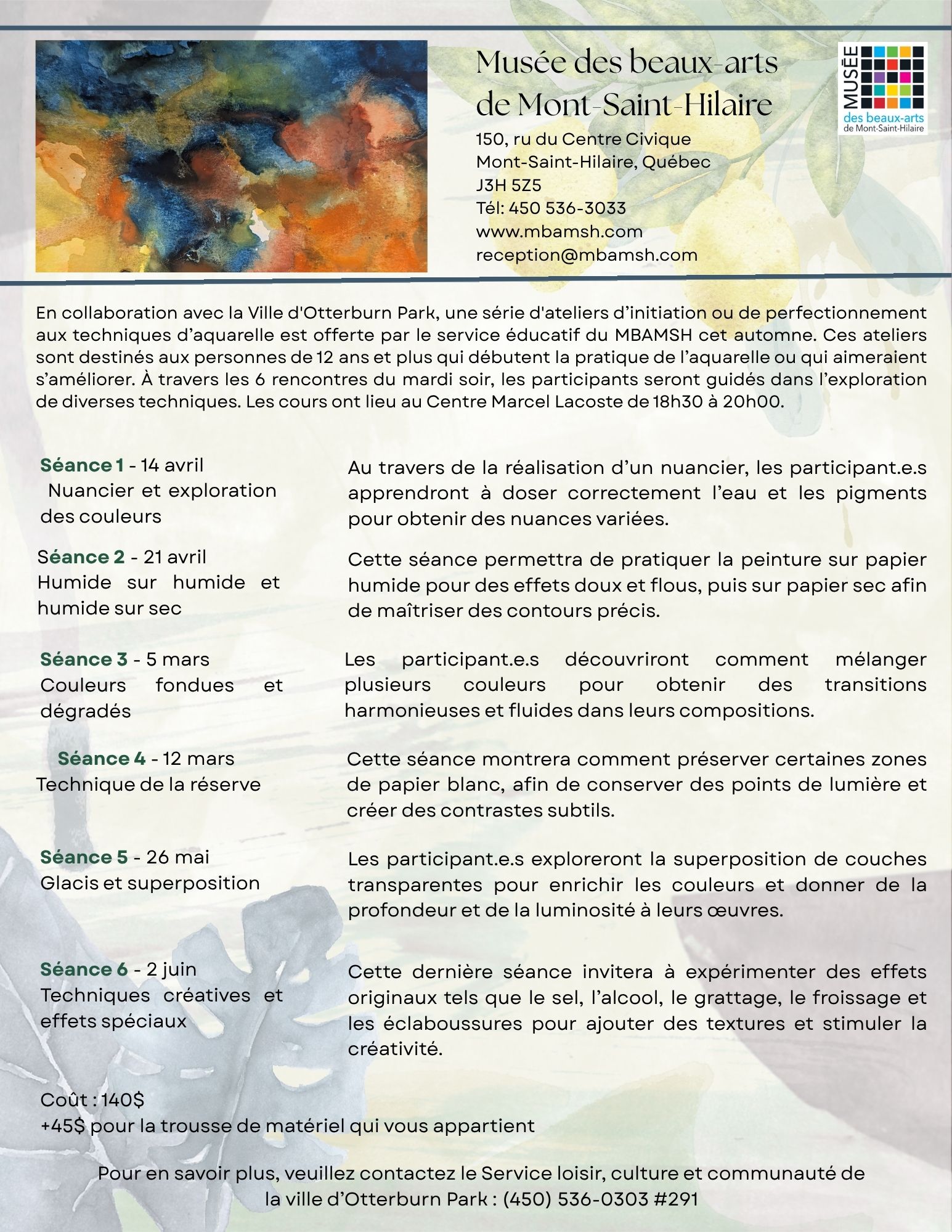 En collaboration avec la Ville d’Otterburn Park, une série d’ateliers d’initiation ou de perfectionnement aux techniques d’aquarelle est offerte par le service éducatif du MBAMSH cet hiver.